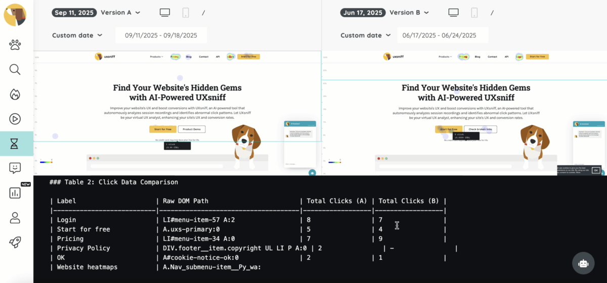 Compare your current page to a past snapshot. AI analyzes session recordings and heatmaps, flags abnormal clicks, and shows conversion impact. Minimal setup.